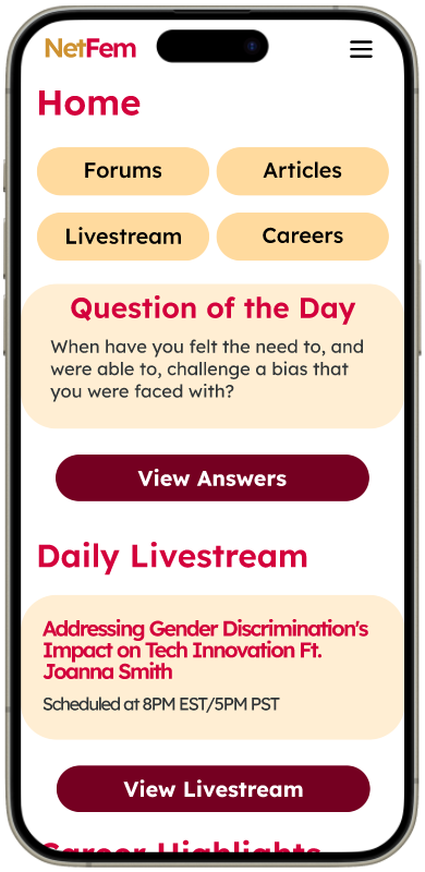 The user research for NetFem was gathered utilizing a semi-structured interview of three participants, and 12 participants answered a Google Forms survey. The problem I chose to focus on before collecting interview and survey data was observing gender-based discrimination and increasing access to career opportunities in technology spaces.